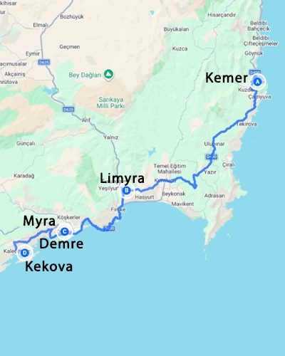 Distance:The distance from Demre to Kemer centre is 100 km.