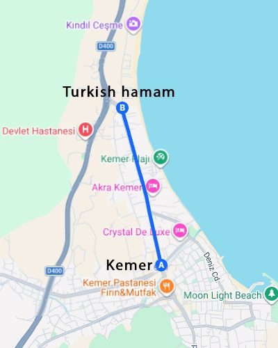 Расстояние:Расстояние от центра Кемера до турецкой бани - 2 км.